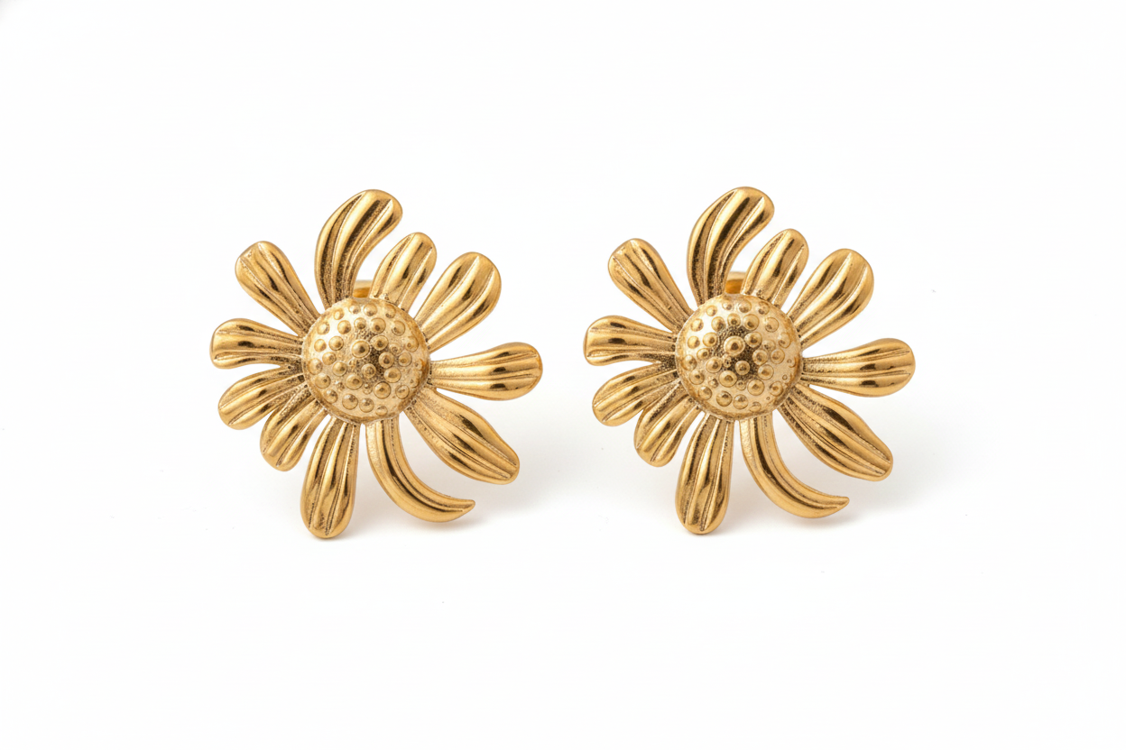 Striking gold-tone floral earrings with a sculpted petal design. Bold, elegant & perfect for festive wear, parties, or elevating simple outfits with a luxe touch .