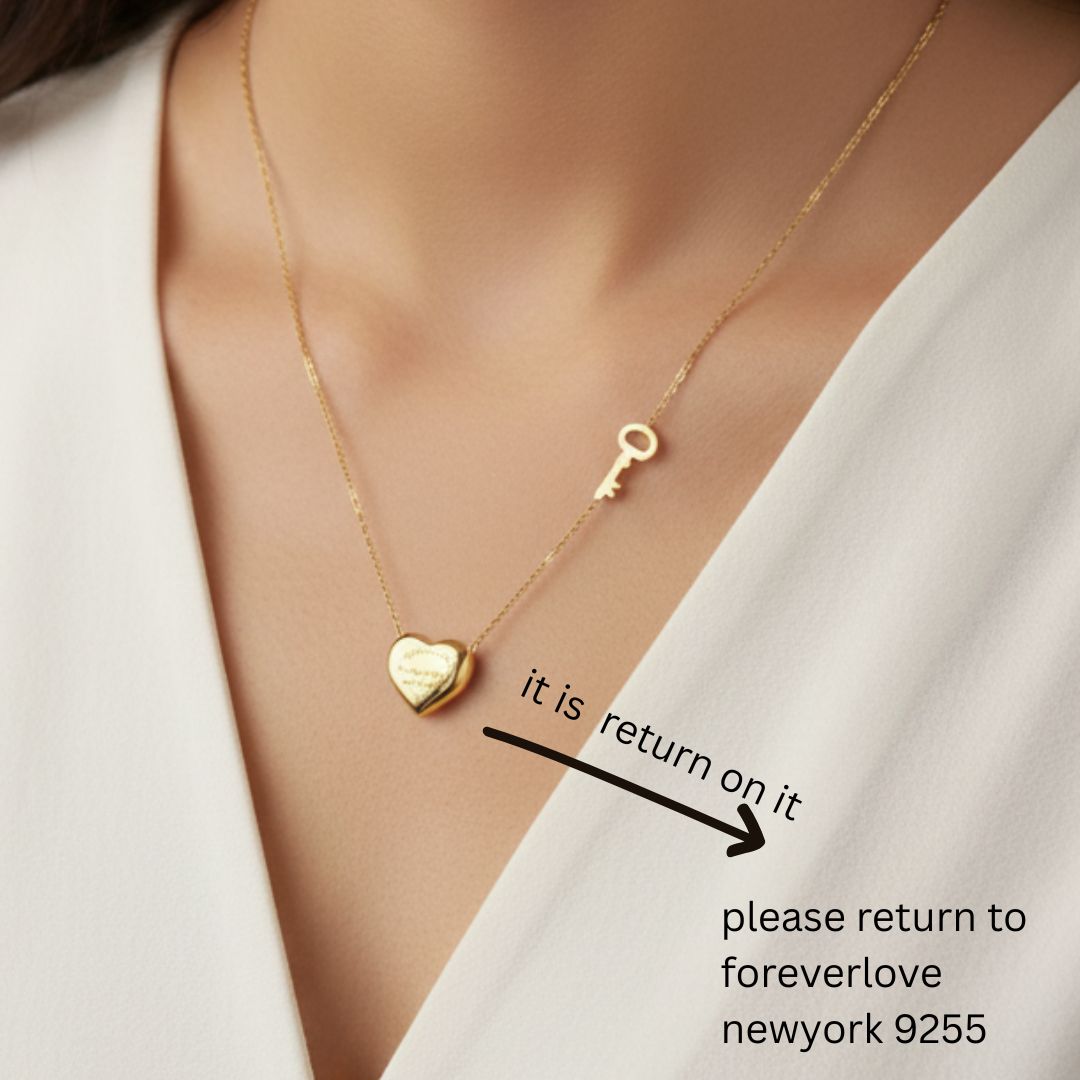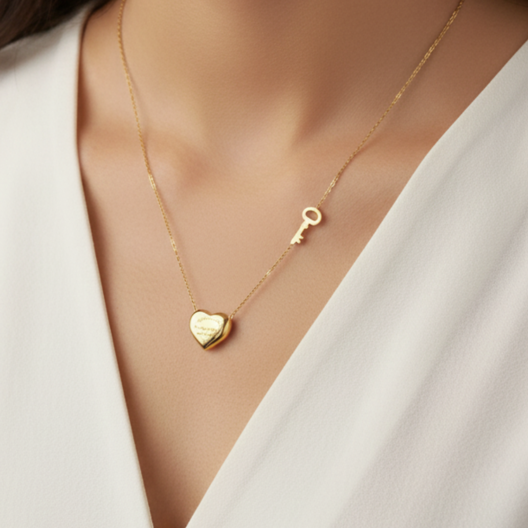 Minimal heart and key pendant necklace in yellow gold tone, symbolising love and connection. Lightweight, elegant and perfect for daily wear or gifting. Included a free gift.