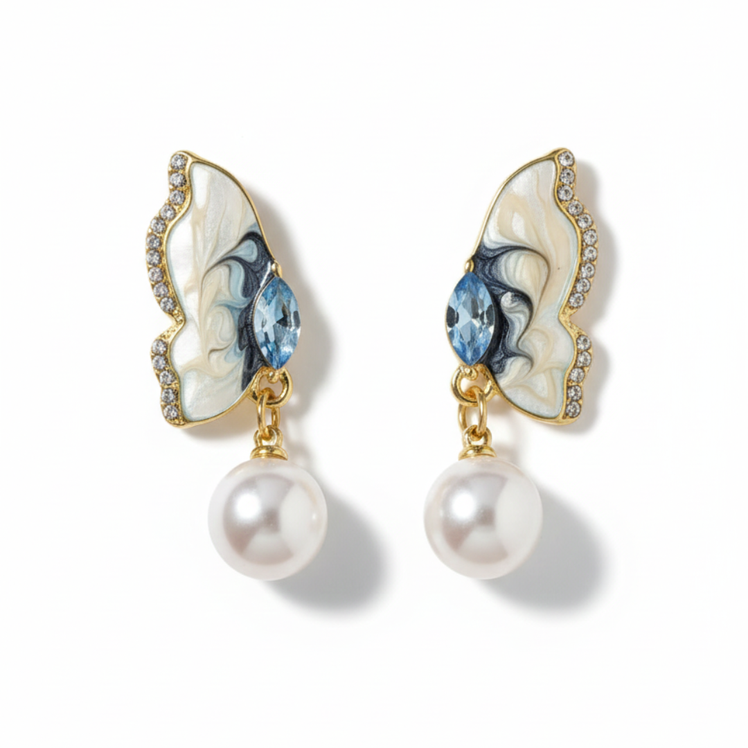 Elegant wing-shaped earrings with soft enamel detailing, sparkling accents, and a graceful pearl drop. Lightweight, dreamy & perfect for classy everyday or festive looks . FREE gift included!