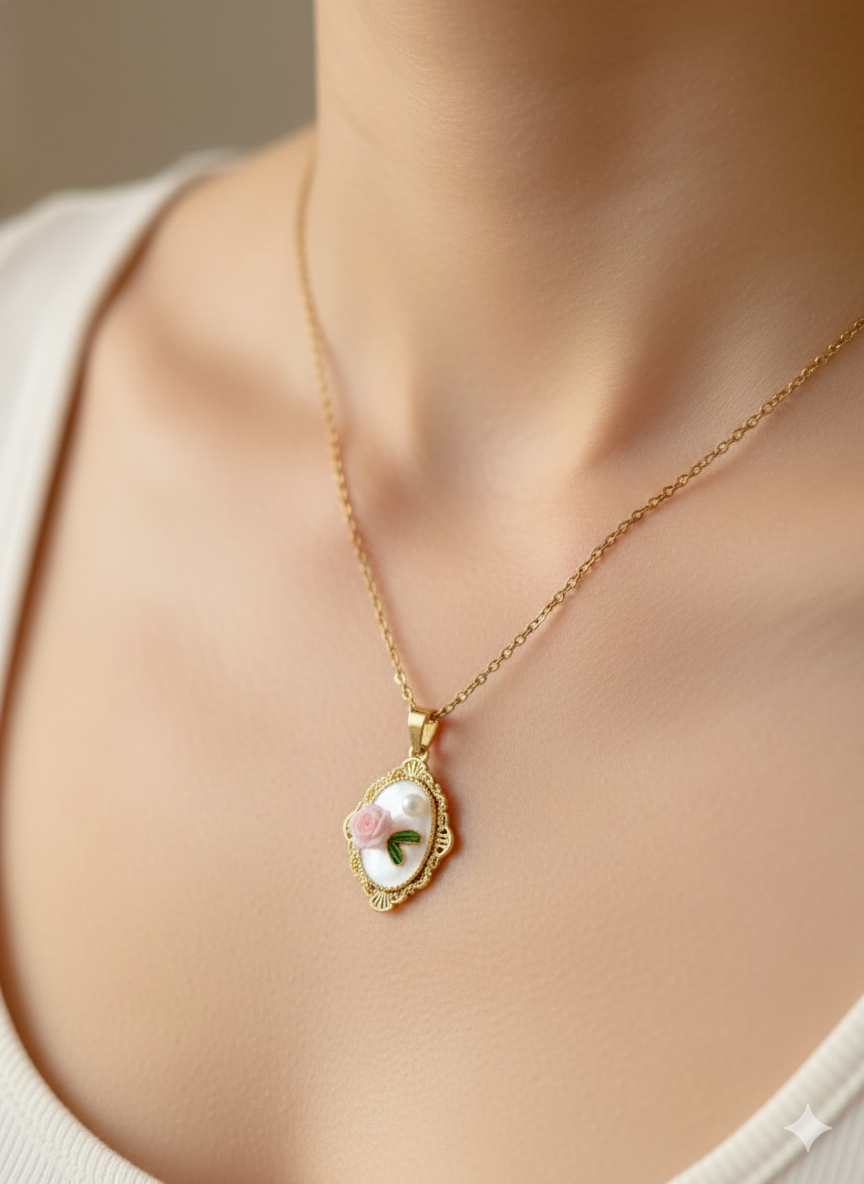 Vintage-inspired rose pendant necklace in yellowish gold. Elegant, lightweight, and perfect for everyday wear or romantic gifting.